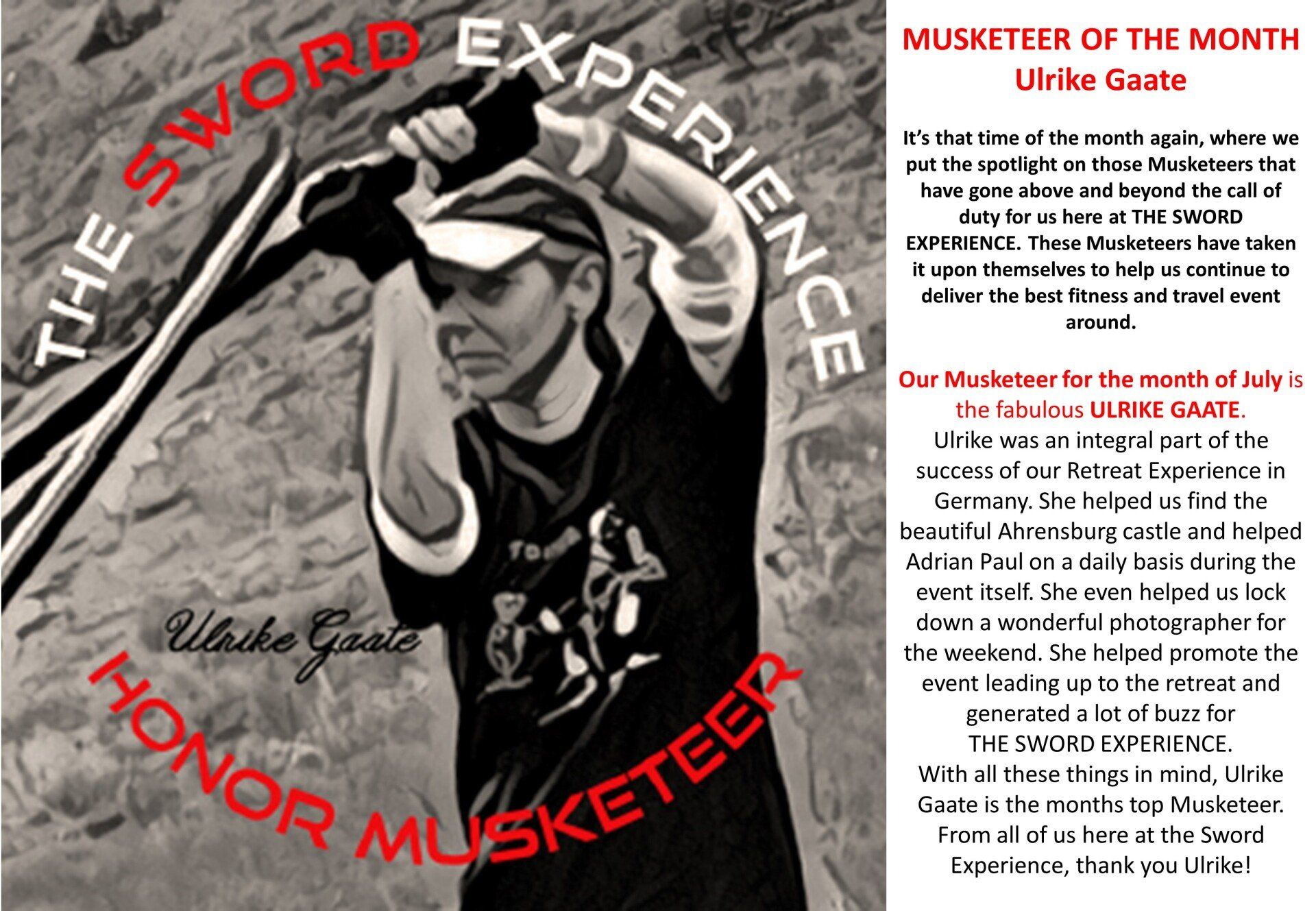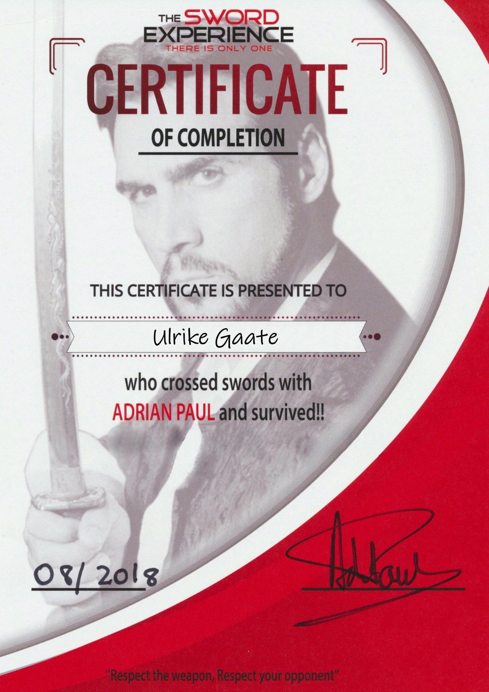 Unter der Leitung von Adrian Paul lernen die Teilnehmer vor traumhaften Kulissen wie Burgen, Schlössern, Ruinen und historischen Plätzen Schwertkampf-Choreographien aus beliebten Serien und Filmen wie Highlander, Game of Thrones, Arrow, Kill Bill, Der 1. Ritter etc. Der Tag wird von professionellen Fotografen und Videofilmern begleitet und zum Abschluss mit den Teilnehmern ein Kurzfilm gedreht. So erhält die Gruppe einen Einblick, wie beim Film gearbeitet wird und wie man Actionszenen zusammensetzt, ganz wie in Hollywood. Geeignet für Anfänger und Fortgeschrittene aller Altersklassen (Kinder ab 15 Jahren).